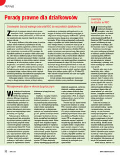 ● W rubryce „Porady prawne dla działkowców” podajemy wyjaśnienia najważniejszych i aktualnych kwestii prawnych związanych z użytkowaniem działki i członkostwem w PZD. W tym numerze: „Stosowanie decyzji walnego zebrania ROD do wszystkich działkowców”, „Wynajmowanie altan w okresie turystycznym przez działkowców”, „Zwierzęta na działce w ROD”.
