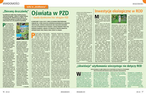● Chcecie być na bieżąco? Czytajcie „Wiadomości”! „Tylko w działkowcu” znajdziecie aktualne informacje na temat wydarzeń w Związku i w ogrodach! W tym numerze: „Zbieramy deszczówkę”, „Oświata w PZD – narada dyrektorów biur okręgów PZD”, „Inwestycje ekologiczne w ROD”, „»Likwidacja« użytkowania wieczystego nie dotyczy ROD”.