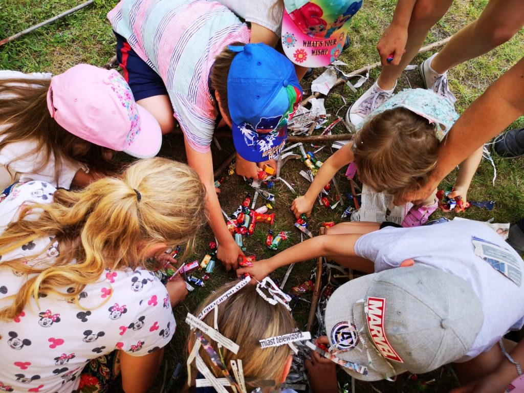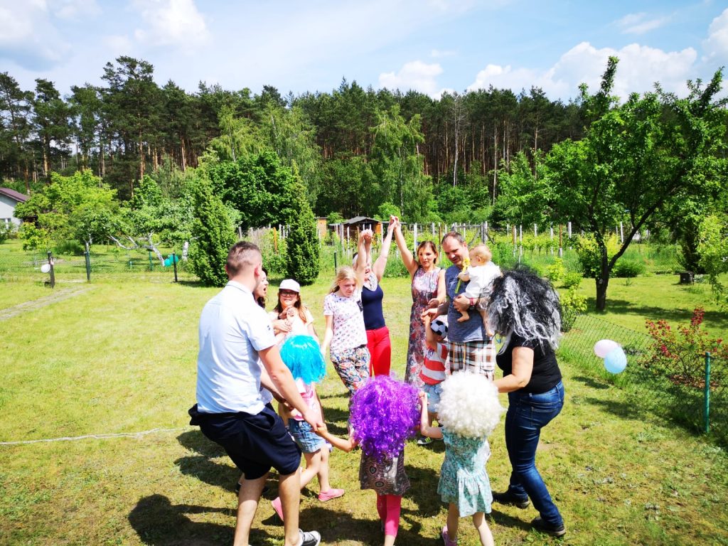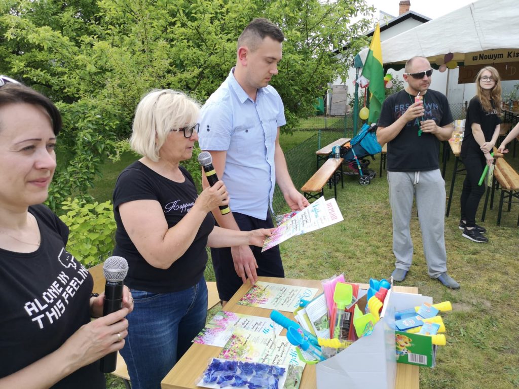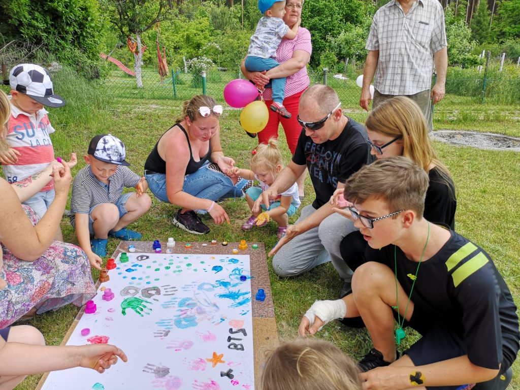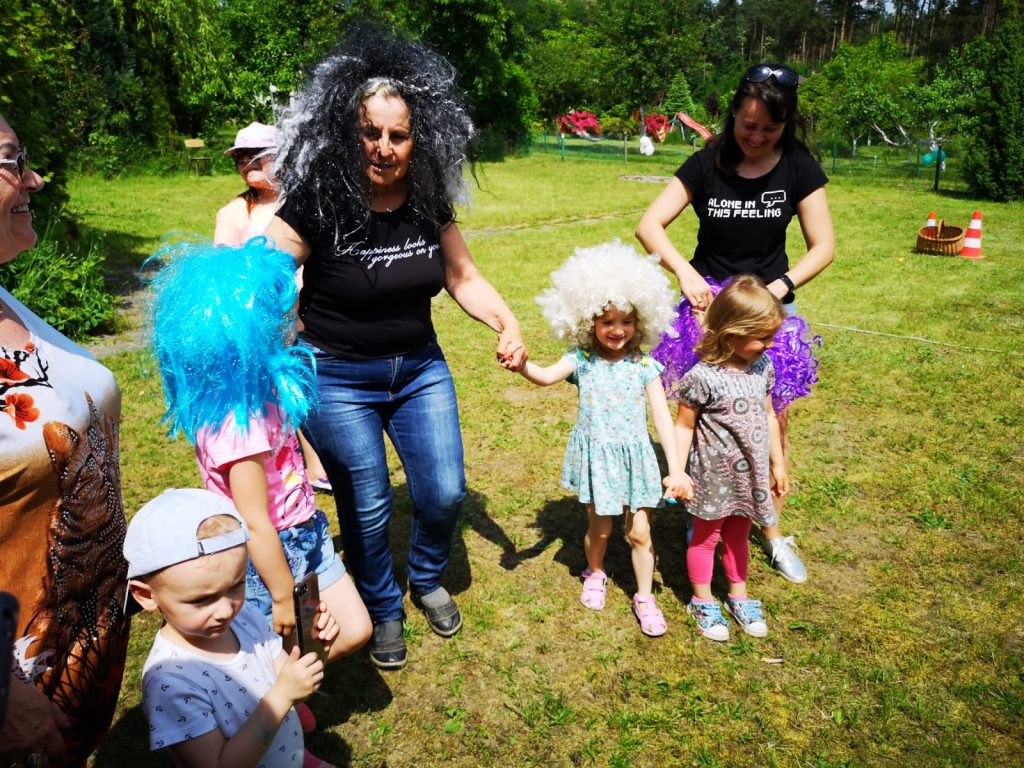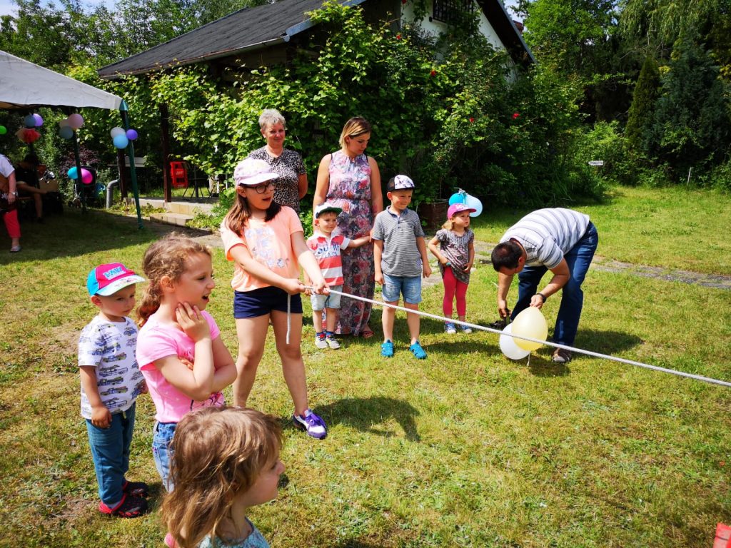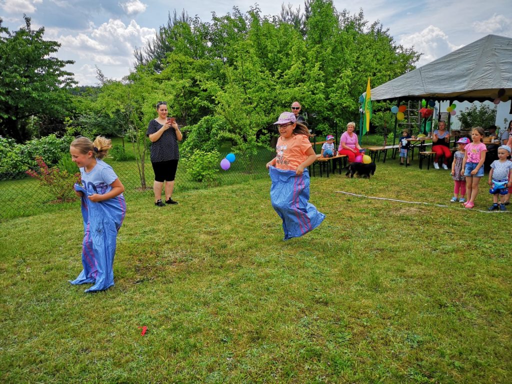 Drugim etapem był festyn sportowo-rekreacyjny przy biurze ogrodu, które poprowadziła Pani Wiceprezes Monika Konopczyńska. Dzieci brały udział w konkursie malowania rękoma, biegów w workach, rzut piłką do kosza, przeciąganie liny, były również wspólne tańce wraz z przebierankami.
