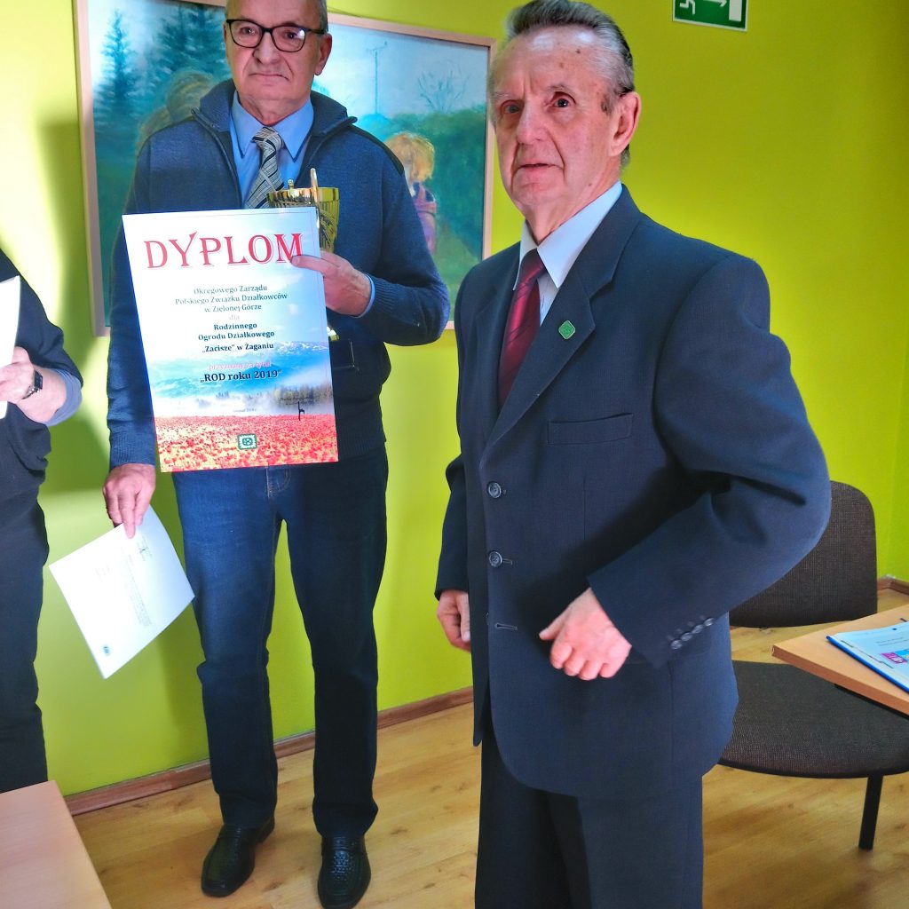 Uroczyste wręczenie pucharów, dyplomów, listów gratulacyjnych, nagród pieniężnych dla ogrodów i kart podarunkowych dla laureatów konkursu na „Wzorową działkę 2019r” dokonał Pan Marian Pasiński i Pani Joanna Mikołajczyk. Ponadto ROD „im. Bolesława Chrobrego” w Szprotawie za tytuł „Najlepszy Rodzinny Ogród Działkowy roku 2019” otrzymał również tablicę okolicznościową.
