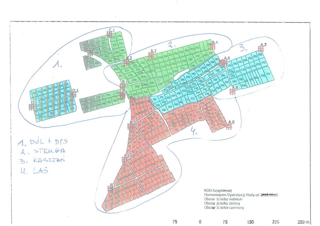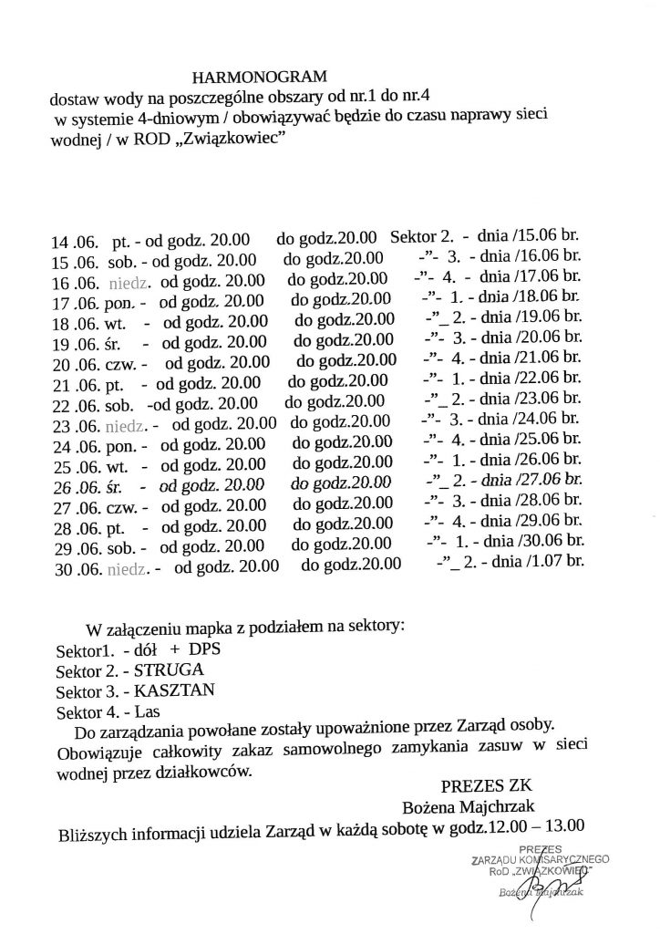 Poniżej harmonogram dystrybucji wody i szkic sektorów ROD „Związkowiec”.